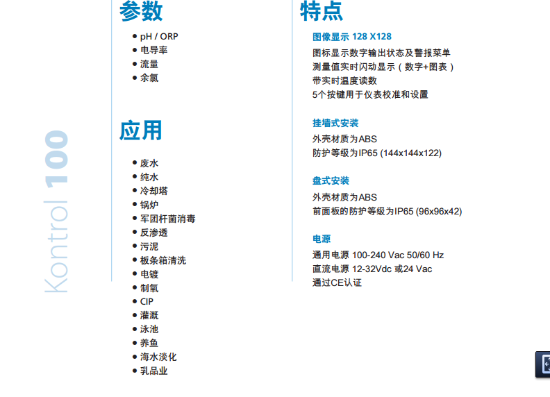 Kontrol 100系列單參數儀表 是一款設計用于滿足礦泉水加工、純水、CIP、食品生產及加工、鍋爐水處理等諸多水處理領域之水質檢測控制儀表。